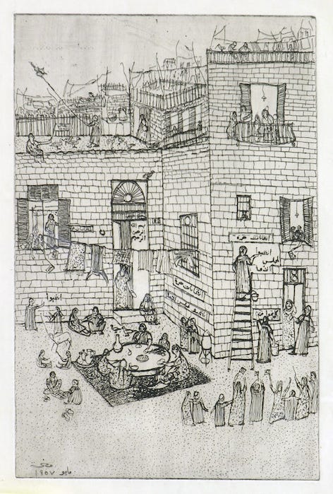Not only did these historical etchings provide a small window into Egypt’s forgotten past, they also shed light on the country’s downtrodden majority and the districts they resided in. Much as she did during her time in England, Helmy traveled around her native land and recorded everything she saw in her extensive catalogue of etchings. There were agricultural landscapes being worked by peasants, fishermen on the Nile, workers labouring inside brick factories, and alleyways reminiscent of the scenes portrayed in Nobel laureate Naguib Mahfouz’s stories. These detailed scenes depicted life in Cairo at the time and reflected the artist’s inherent socialism and her insistence on using art as a platform to empower Egyptians.