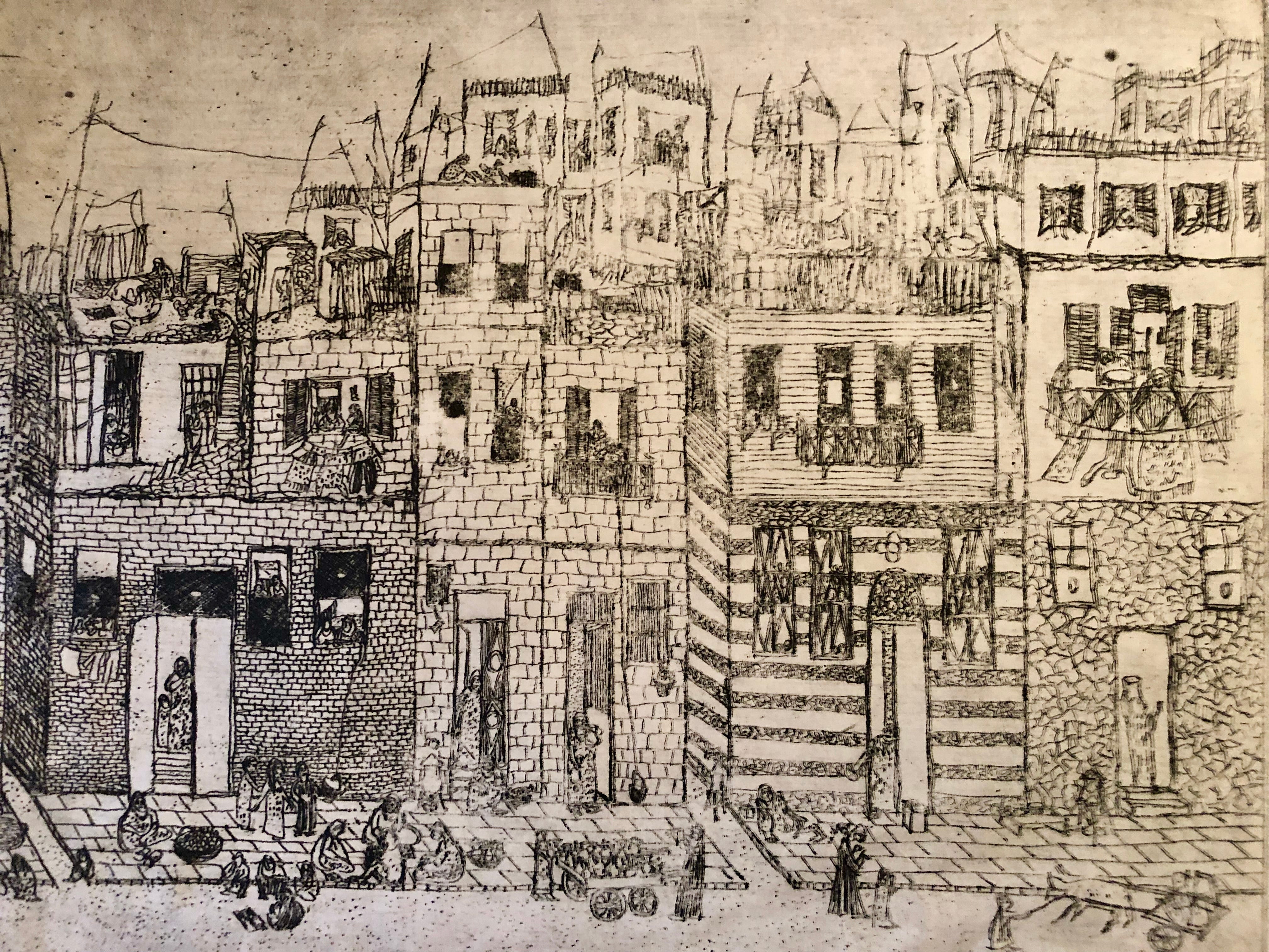 Helmy won the Ljubljana Honourary Prize in 1961 for her Old Cairo (fig. 3) print, which was displayed at the Ljubljana Biennale for Graphics that same year. The print depicts a narrow alleyway in Cairo’s Bulaq neighborhood packed with a dense row of apartment buildings. It is a work brimming with life. There are locals strewn across the street and hanging out of windows and balconies, street vendors selling fried snacks and children playing — all of which was presented in a detailed and geometrically sound composition. It is also a deeply socialist work embedded with a sensitive understanding of Egypt’s majority that characterize Helmy’s etchings. Bojana Videkanic reiterated this statement in her research6 on the Ljubljana Biennale, stating that “her representations of the masses are not there for political nationalistic exaltation; rather, they signal people’s sense of self and identity as collectivity created through everyday social bonds of labor, play, and caring.” (Videkanic 2020)