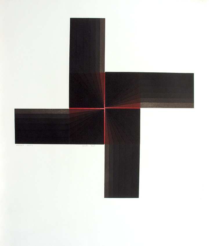 Over the course of the next decade, Helmy continued to purify her art of the residue of visual reality. Influenced by Islamic and Pharaonic art, Helmy used geometric abstraction as an avenue to connect science and art with her inherent spirituality. There is harmony and rhythm to her work – a sense of comfort and tranquility that is the result of endless hours of patience and deliberate printmaking artistry. In many ways, Helmy succeeded in creating a pictorial language with her abstraction, one rooted in simple geometric forms presented in various non-illusionistic compositions. It is elemental, pure, and highly emotive.